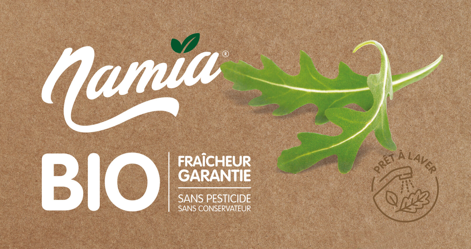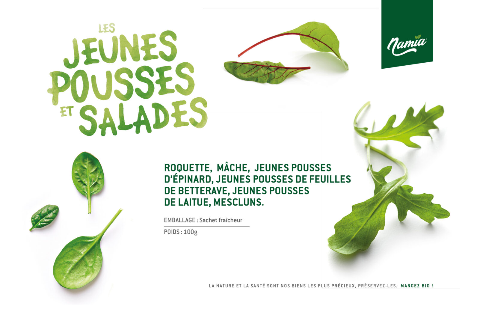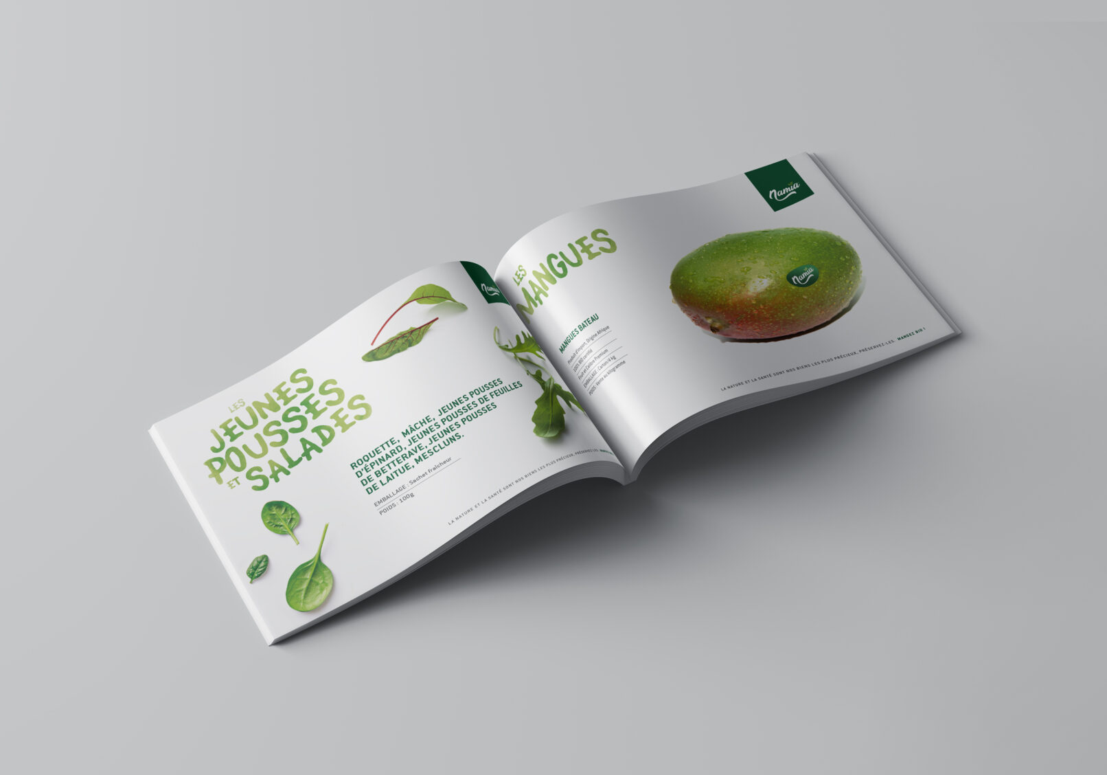 Design de l’identité visuelle « Namia ». Logotype, catalogue produits Bio et gammes packagings.