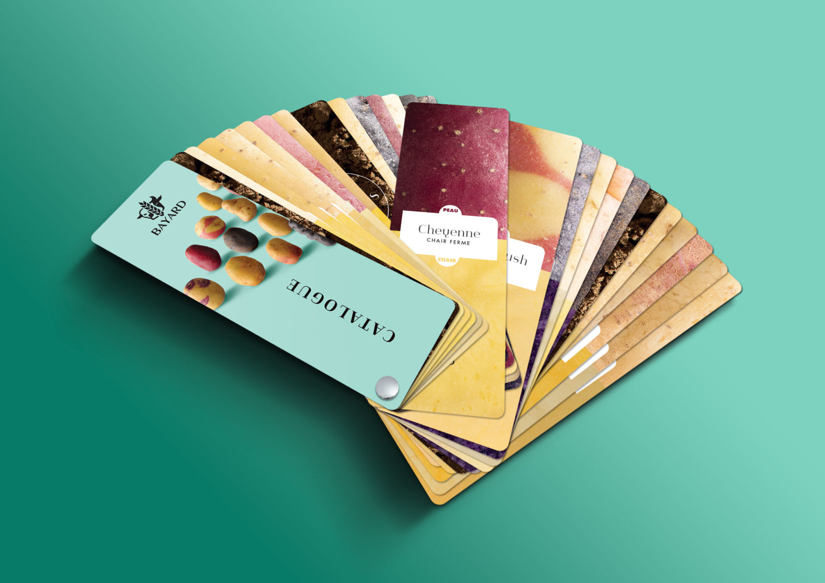 Conception et réalisation de visuels institutionnels pour la marque Bayard la pomme de terre, affiches, catalogue (nuancier), kakémonos, conception de visuel nature morte.